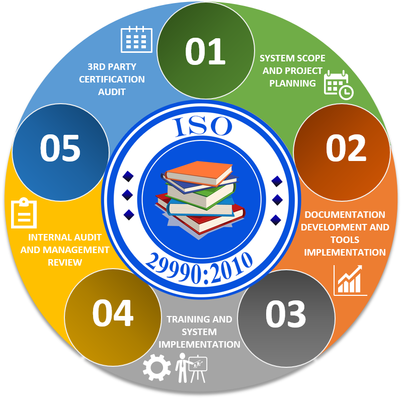 What is ISO 29990:2010 ? Note:- This Standard has been Withdrawn & Replaced by ISO 29993:2017 ISO 29990 sets out the criteria for a Quality Management System standard for providers of education and training services. ISO 29990 provides a unified standard for learning service providers, including corporations, vocational institutions, and life-long learning centres, around the globe. It promotes the design of suitable services & evaluation of learning results. The aim of ISO 29990 is to provide a generic model for quality professional practice and performance for learning service providers (LSPs) in the development and delivery of education, training. The standard follows a process-based structure to ensure its implementation leads to continual improvement. The standard’s ultimate aim is assuring the implementation of high-quality tutorial programmes and processes. |
