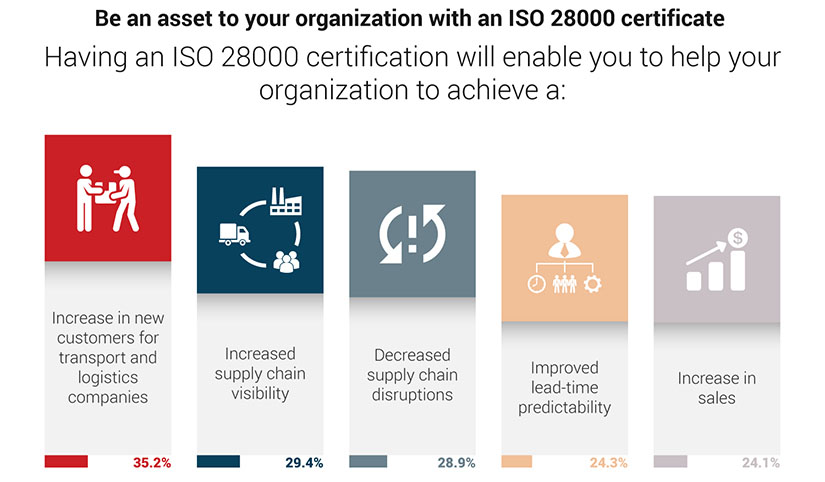 Why is Supply Chain Security Management System important for you? An ISO 28000 certification demonstrates that you are an asset to your organization and that you are a trustworthy expert. It enables you to help the organization in establishing a Security Management System (SMS) that ensures the sufficient management and control of security and threats, coming from logistical operations and supply chain partners. With an ISO 28000 certification, you will gain visibility in the market and you will help your organization to improve their profitability and quality. |